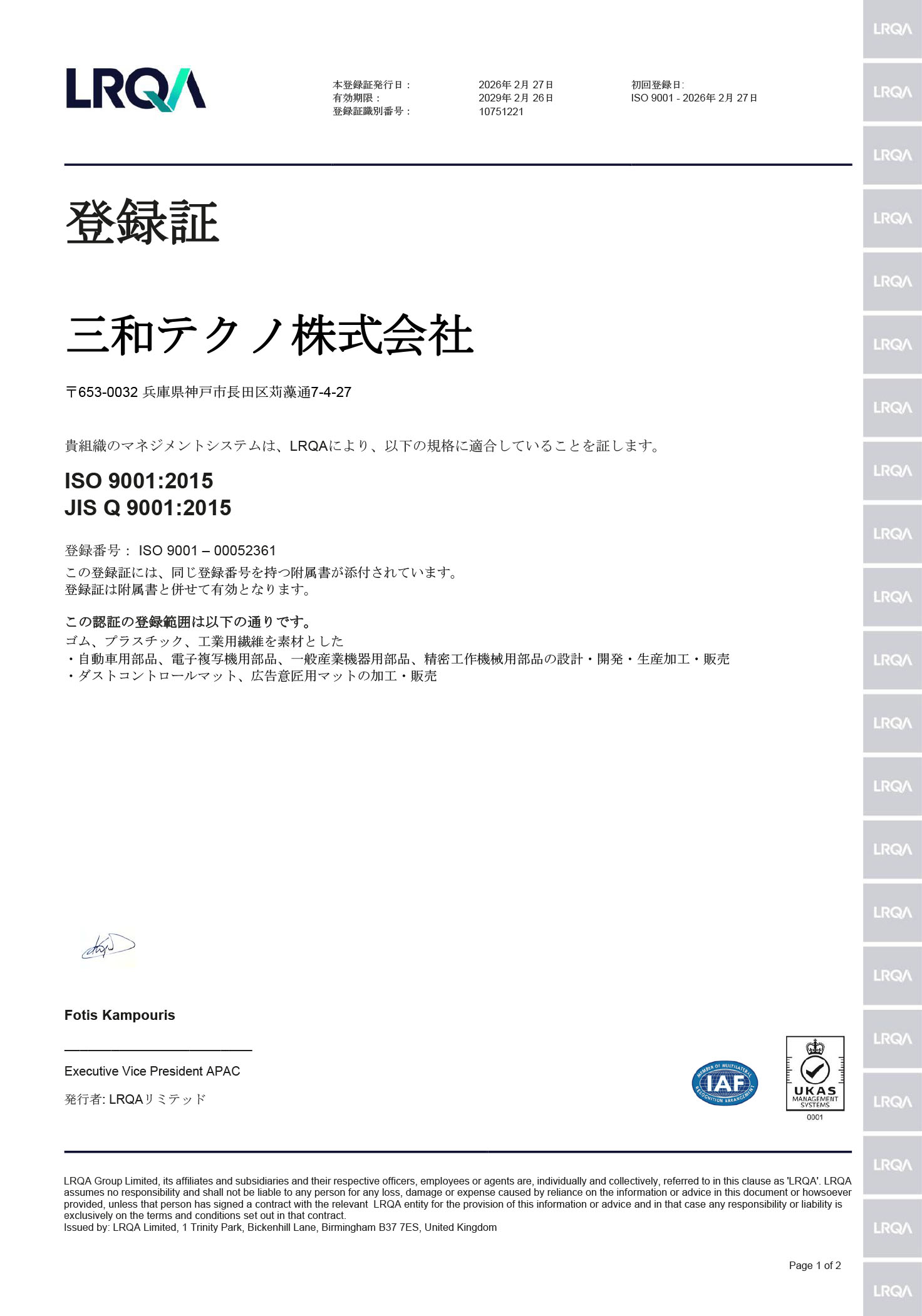 私たち、三和テクノ株式会社は、シール機能部品(自動車関連・OA機器・工作機械・一般産業)および玄関マットの部材である ゴム・プラスチック・繊維・粘着シートの加工を中心とした事業活動におけるすべての分野で、全員の創意・工夫と行動力を結集し、品質の向上および環境の保全と汚染予防に積極的に取り組みます。