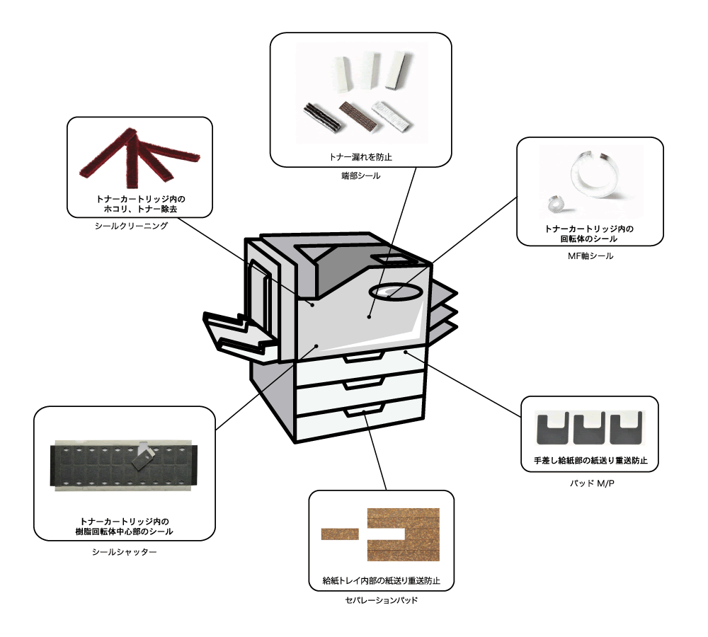 “世界一のシールメーカー”を目指して、プリンター・コピー機などに使用するシール材の開発・設計・製造・販売を行っています。 特に電子写真技術における「回転体部の粉体をシールする」ということに重点を置き、研究開発室を中心とした素材の開発・設計・試作・評価までを社内で一貫して行う体制をとっています。